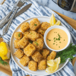 Crispy and flavorful Air Fryer Salmon Nuggets coated in seasoned breading and served with a spicy sriracha mayo dipping sauce. These bite-sized salmon pieces are easy to prepare, air-fried to perfection, and make a perfect snack or appetizer.