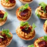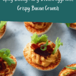 - Garnish: Cut the cooked bacon slices into 12 equal pieces. Top each deviled egg half with a celery leaf and a piece of bacon to garnish.