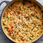 This Burst Cherry Tomato Orzotto is a comforting and flavorful Italian-inspired dish that features tender orzo pasta cooked in a rich, thickened burst cherry tomato sauce infused with fresh basil, garlic, and a hint of red pepper. Finished with creamy Parmesan and a touch of lemon juice, this one-pot recipe delivers a luscious, creamy texture with bright and savory notes, perfect for a satisfying weeknight meal.