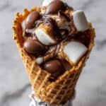 1. Prepare the cones: Fill each waffle cone by alternating layers of mini marshmallows, chocolate chips, and optional candy fillings, finishing with your favorite candy on top to create a rich, sweet mixture inside each cone.