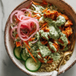 Crispy Chicken Tikka Bowls with Mint Sauce combine flavorful breaded chicken glazed with spicy tikka masala sauce, served over nutty quinoa and fresh vegetables. This vibrant dish features a tangy coleslaw, crisp cucumber, pickled red onions, and a cooling homemade mint sauce, creating a perfect balance of spicy, salty, creamy, and refreshing flavors for a wholesome and satisfying meal.