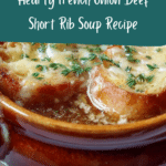 A rich and hearty French Onion Beef Short Rib Soup featuring tender beef short ribs slow-cooked with caramelized onions in a flavorful beef broth, topped with melted cheese for a comforting and satisfying meal.