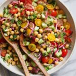 A vibrant and refreshing Chickpea Salad bursting with Mediterranean flavors, featuring a zesty lemon and garlic dressing, fresh herbs, crisp cucumber, sweet grape tomatoes, tangy pickled onions, and briny kalamata olives. Perfect as a light lunch or a colorful side dish.
