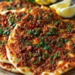 Lamb Lahmacun, often called Turkish pizza, is a flavorful flatbread topped with a spiced lamb mixture and fresh herbs. This delicious dish combines savory meat, tangy sumac onions, and a refreshing chopped salad for a meal that’s both satisfying and vibrant.