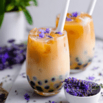 - Finish and Serve: Pour the cooled lavender Earl Grey tea over the ice and tapioca pearls. Top each glass with ¼ cup almond milk (to total ½ cup for two servings) and gently stir before serving for a creamy, floral milk tea.