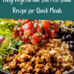 A vibrant and wholesome Vegetarian Burrito Bowl featuring fluffy rice, seasoned beans, and a colorful mix of sautéed vegetables, perfect for a nutritious and satisfying meal.