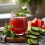 A refreshing Watermelon Cucumber Cooler that combines juicy watermelon and crisp cucumber with zesty lime and fresh mint, served chilled over ice. Perfect for hot summer days as a hydrating and revitalizing beverage.